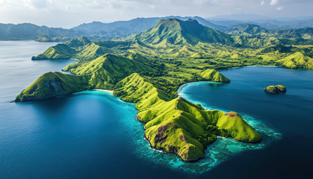 Aerial view of green coastal hills and turquoise waters, lush island landscape
