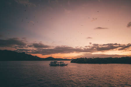 A woman standing on top of a small island, enjoying the morning sun over Komodo National Park, Flores, Indonesia. Golden hour over the islands and sea. Some boats anchored to the bay. New day beginning