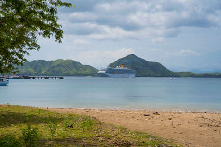 Komodo Dragon, the largest lizard in the world walks free on the beach next to the boats. It is a dangerous and carnivore prehistoric animal. Komodo Island, Indonesia, south Asia.