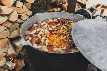 Fruit hot drink cooked in big metal can container outdoors. Field kitchen or festival food