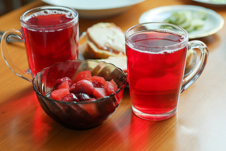 Dried fruits compote. Glass cups with drink from dried fruits, apples, meats, raisins with sugar. A curative and preventive drink for colds.