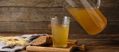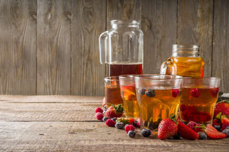 Sweet homamde fermented Kombucha drink. Kombucha fruit and berry tea, on wooden background with fresh berries