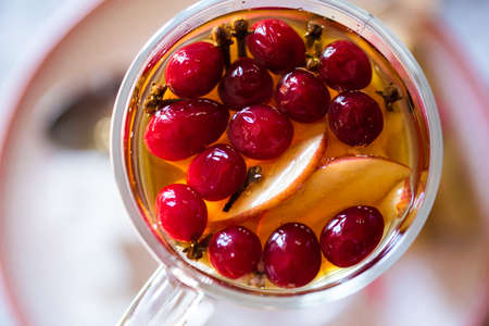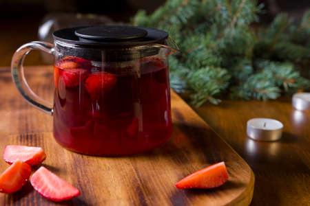 Hot strawberry tea with spices in a glass teapot. Health fresh fruit drink. Enjoying hot beverage in cold winter christmas eve.