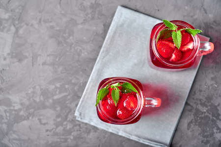 Homemade sweet strawberry compote with mint in glass mason jars on gray stone concrete background, copy space.