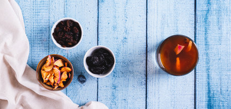 Fruit infused water with dried apricots, herbal tea in a teapot on plaster background, high angle view.