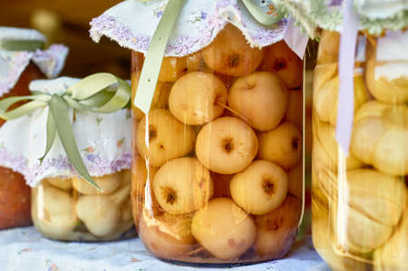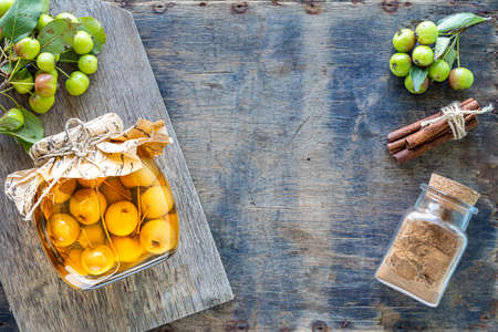 Paradise apples in sugar syrup on an old wooden background. Harvesting the autumn harvest. Paradise apple jam. Top view. Copy space