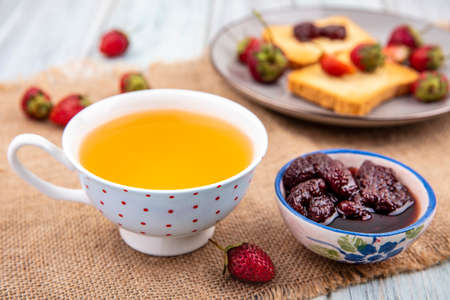 top view of strawberry jam on a bowl with a cup of tea on a sack cloth on a grey wooden background