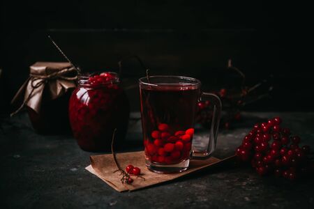hot tea made from cranberry. Homemade jam in a glass jar on a dark background. Winter christmas drink