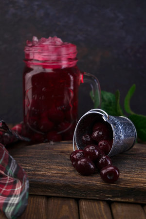 A small aluminum bucket with fresh organic red cherry fruits scattered on a wooden old textured board against a glass jar of cherry cocktail with ice and mint leaves. Food photo.