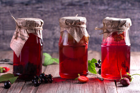 Jars with kompot on table. Sealed glass jars with kompot placed on table near flowers and fruits on summer day in garden.