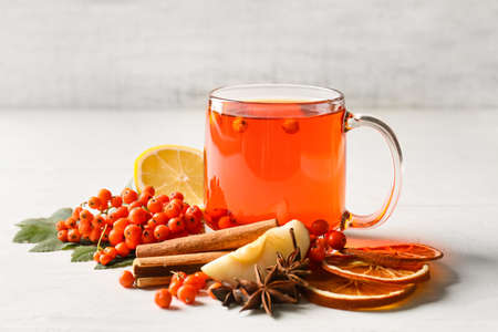 Hot tea with ginger, cranberries, apples and honey is poured from a teapot into a cup.