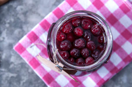 Homemade canned compote with sweet cherries and red currants in glass jar on dark gray background, Vertical format