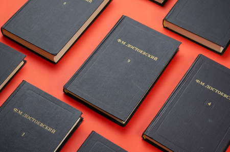 Collector's edition of the Russian writer Fyodor Dostoyevsky. Hardcover Book Multivolume with the writer's surname in Russian: Nikolaev, Ukraine - January 28, 2021.