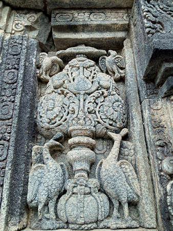 Halebidu, Karnataka, India - November 2, 2013: Hoysaleswara Temple of Shiva. Closeup of lion statues on side of the temple structure in gray stone and some brown background.