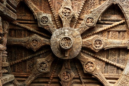 Chariot wheel with eight spokes with a central medallion. The medallions on the wheel spokes are richly carved depicting numerous deities and erotic and amorous figures in various poses. Konark Sun Temple, Orissa India. 13th Century AD.