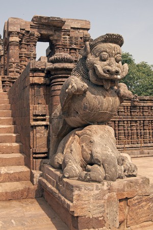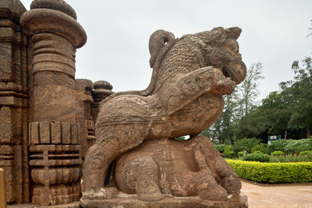 Sculpture of the lion close to ancient Konark sun temple.