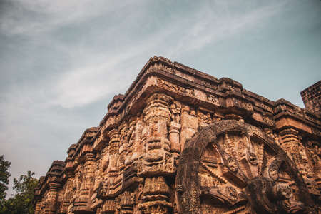 A low angle view of stone sculptures on the walls of Konark Sun Temple, India