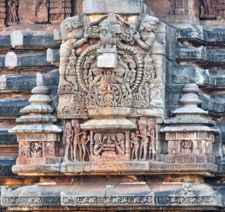 A beautiful Intricate sculptures stone carving on the walls of the ancient Hindu Sun Temple in Konark, Orissa