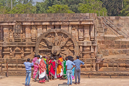 FEBRUARY 6, 2014, KONARK, ORISSA, INDIA - Ancient ruined Sun temple in Konark and unknown visitors