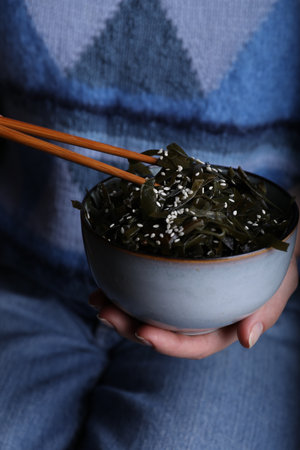 Woman eating fresh laminaria (kelp) seaweed, closeup