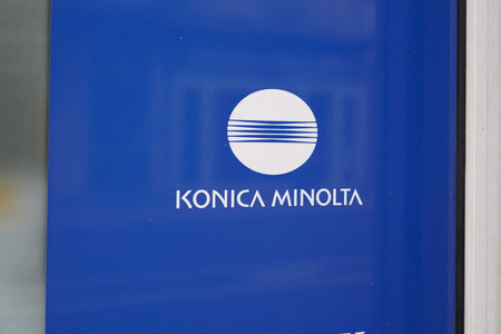 Konica Minolta logo sign on booth stand on Messe fair in Hannover, Germany