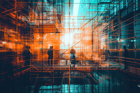 Captivating overhead view of an architectural framework, highlighting intersecting beams and vivid colors. A blend of urban design and modern artistry creates a striking visual.