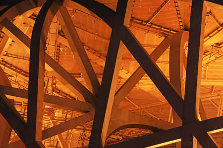 Captivating abstract view of an architectural structure showcasing orange beams and dark supports under a vibrant ceiling, highlighting design and geometry.