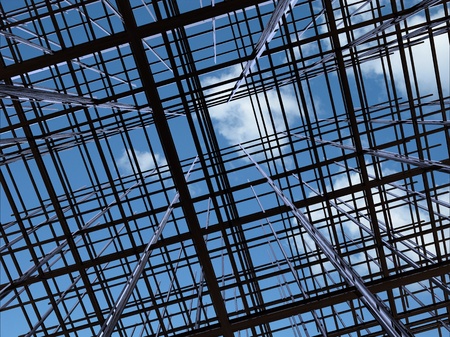 A captivating view of a steel framework structure from below, stretching upwards into a vivid blue sky dotted with white clouds, symbolizing construction and progress.