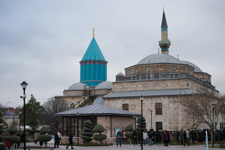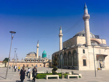 Konya, Turkey - October 08, 2018: People visiting the Mevlana Museum which is the location of the tomb of Rumi, Islamic scholar and poet of the 13th century.
