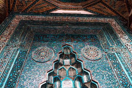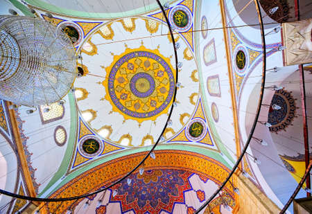Chandelier and colorful decorated ceiling in the interior of a turkish mosque