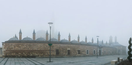 The silhouette of Mevlana Museum is hidden under the hard winter mist, Konya, Turkey.