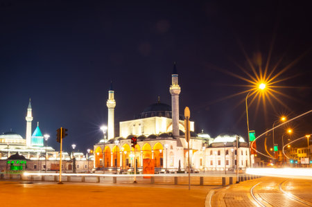 Long exposure night photo of Mevlana Museum and surrounding mosque complex glowing with lights, with blurred street motion and vibrant minarets in Konya, Turkey. Popular attraction landmark Anatolia