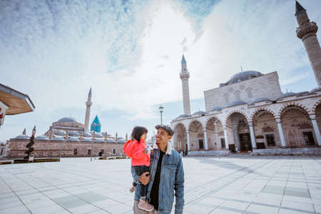 father and his little girl walking around the square in konya turkey enjoying the beautiful islamic architecture