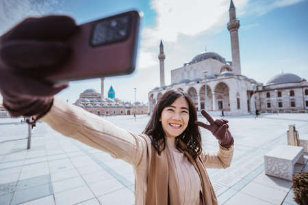 beautiful asian woman taking selfie portrait in front of the mosque in konya turkey