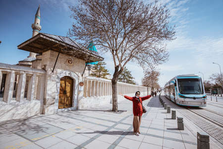 Beautiful girl walking at mosque in Konya, Turkey.