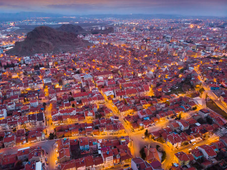 Aerial view of Afyonkarahisar cityscape in winter twilight, Turkey