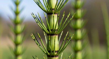 A detailed macro shot showcasing the intricate structure and lush green color of horsetail plants, highlighting their unique segmented stems and delicate foliage.