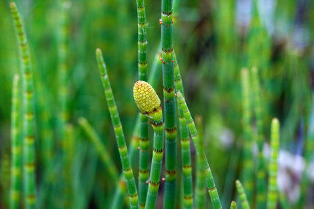 Blooming green horsetail Equisetum in the spring in Greece