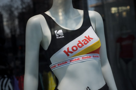 Mulhouse - France - 26 January 2020 - Closeup of Kodak films logo on colorful underwaer on mannequin in a fashion store showroom