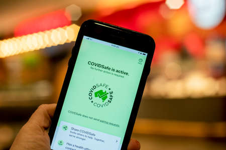 Hand holding a phone with CovidSafe app. Australian Government COVID-19 trace tracking app
