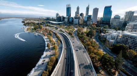 Stunning aerial view capturing a bustling city skyline beside a serene river, featuring a busy highway and lush green parks under a clear sky.