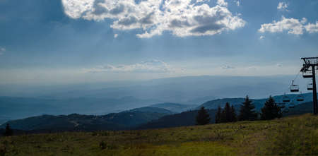 Ski resort, ski slope, ski lift, pine trees and fog mountains panorama