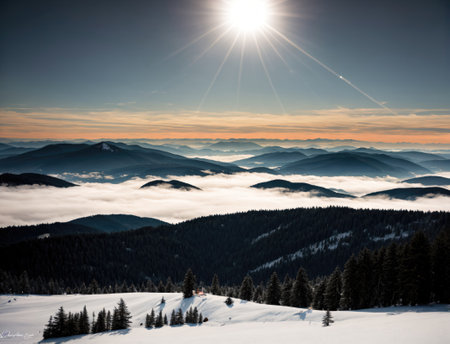Skiing and snowboarding in the breathtaking Carpathian Mountains during a golden sunrise