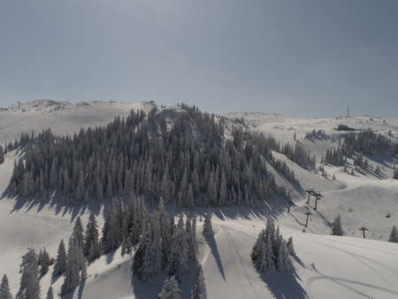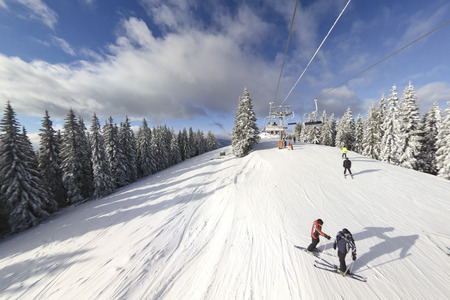 Kopaonik, Serbia - January 22, 2016: Ski resort Kopaonik, Serbia, people on the ski lift among the snowy white pine trees