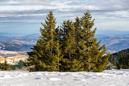 Beautiful landscape of snowy mountains. Beautiful winter nature landscape amazing mountain view. mountain range and pine tree forest with thin snow.