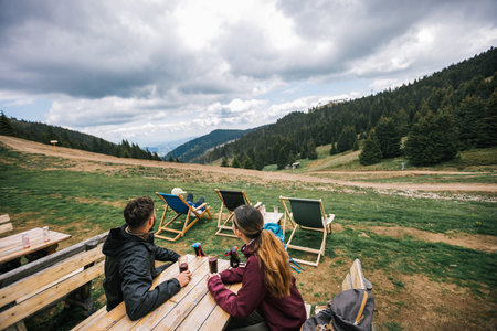 Two hikers relax in a mountaintop restaurant after a hike, drinking and enjoying a stunning panoramic view of nature.