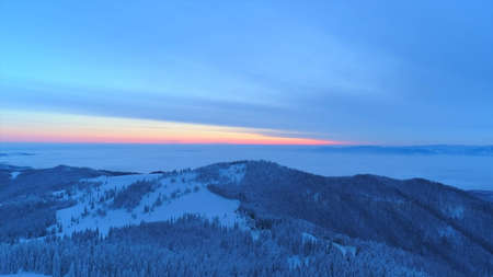 Aerial view of winter mountain landscape with snow covered trees at sunset.