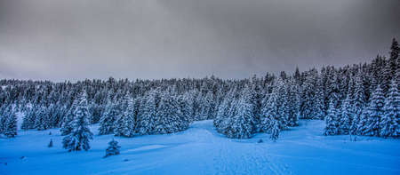 winter scenery of the evergreen forest on the mountain, Zakopane, Poland. High quality photo