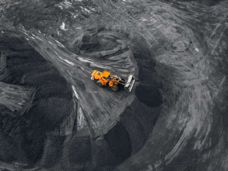 Yellow excavator loads coal into crusher. Open pit mine, extractive industry, top view aerial drone