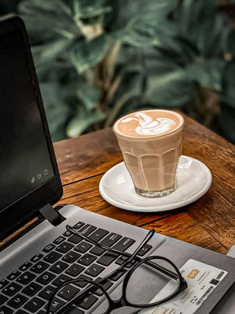 Coffee cup and laptop on wooden table in coffee shop.